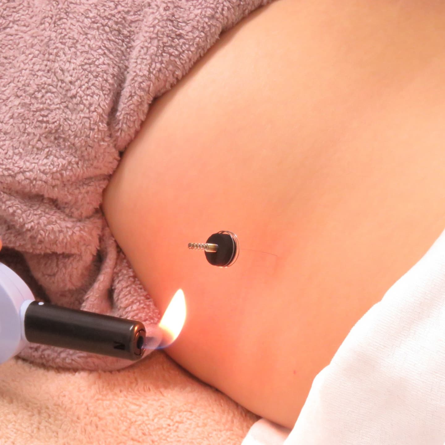鍼の先に専用の炭を載せ火をつけます。炭の熱が深部まで入ることで深部温を高めることができます。